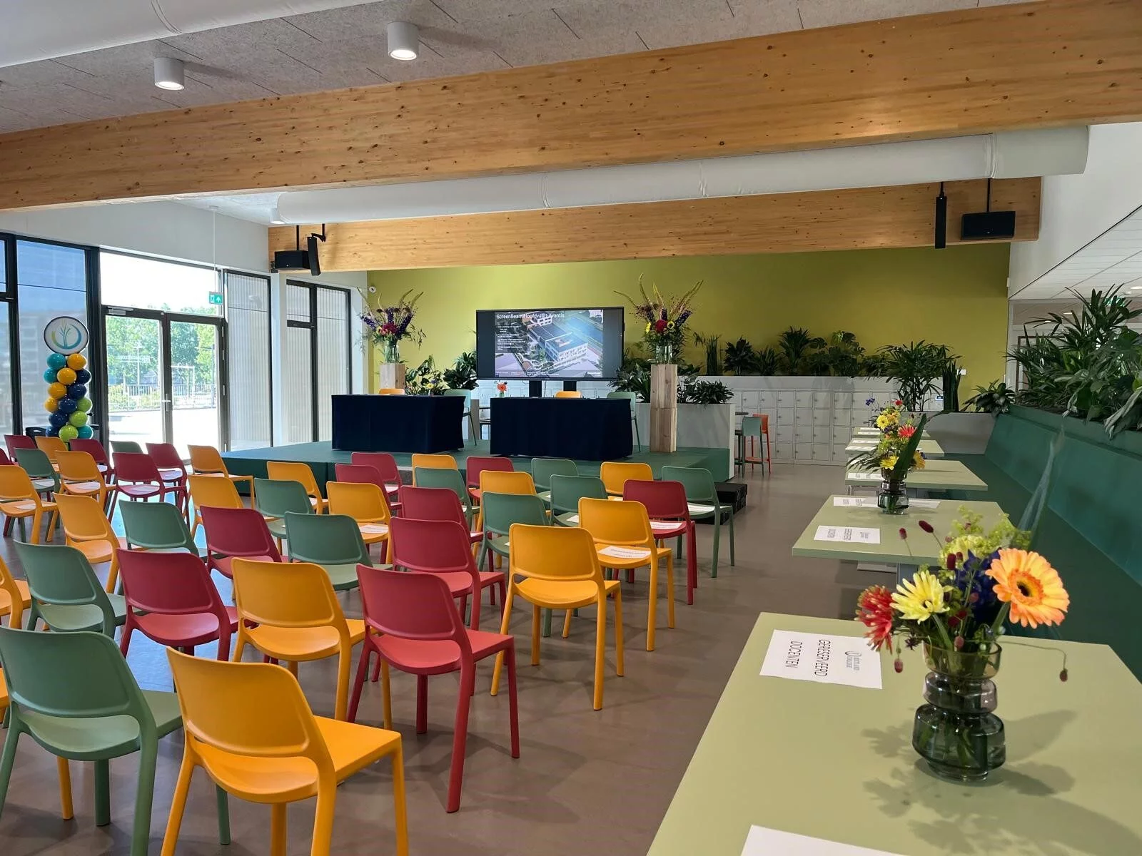 Alle voorbereidingen waren klaar, de loper lag uit, een aantal leerlingen had hard gewerkt om de bloemen te schikken en de hapjes klaar te maken. De aula zag er versierd met bloemen en ballonnen schitterend uit, oftewel het feest kon beginnen!